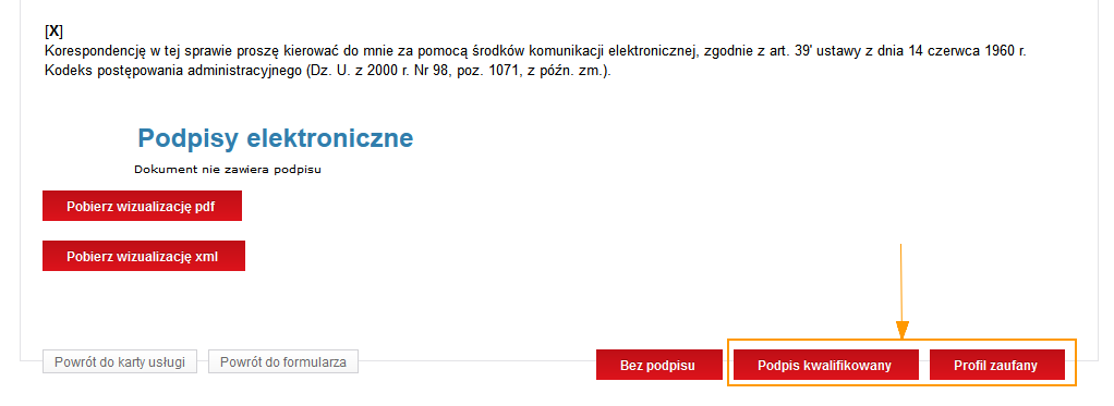 Uwaga: w przypadku, gdyby podpis dla danej usługi nie był wymagany, na omawianym etapie, użytkownik będzie miał do dyspozycji przycisk Bez podpisu, którego użycie spowoduje wyświetlenie zabezpieczenia reCAPTCHY (dla niezalogowanych użytkowników).